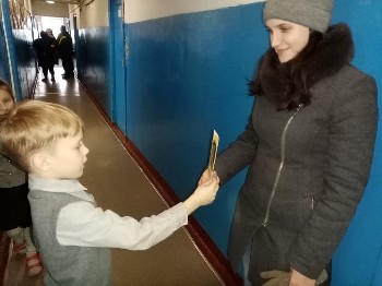 Обучющиеся 1-б класса раздавали листовки и буклеты "Блокадный хлеб" учителям и прохожим